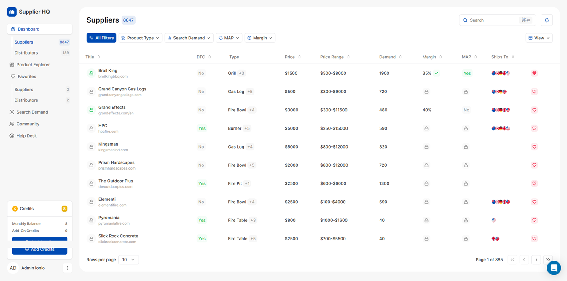 The moment you log in, the supplier database opens up. Search through thousands of verified suppliers and distributors, filter by category, product type, and country. Every record includes the supplier name, website, product types they carry, average price points, price ranges, search demand data, average margins, MAP policy status, and direct contact access. What used to take hours of Googling—laid out in a single, searchable interface.